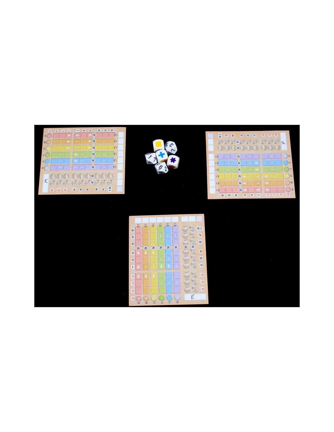 On a turn as the active player, you roll the six dice — three six-sided color dice and three ten-sided dice numbered 0-9 — then choose one number die and one color die, then mark this number in this color column on your sheet. If you choose 0 and haven’t started this color column, you can mark the “double point” circle at the bottom of the column. If you choose a non-0 number and haven’t started this column, you write the number in the bottommost space of the column; if you have started this column, then you can add another number to this column only if it’s the same value or higher. (A 0 is written as 10 in a column.) Other players choose a number die and a color die from the two of each that remain, then mark one of their columns in a similar manner.