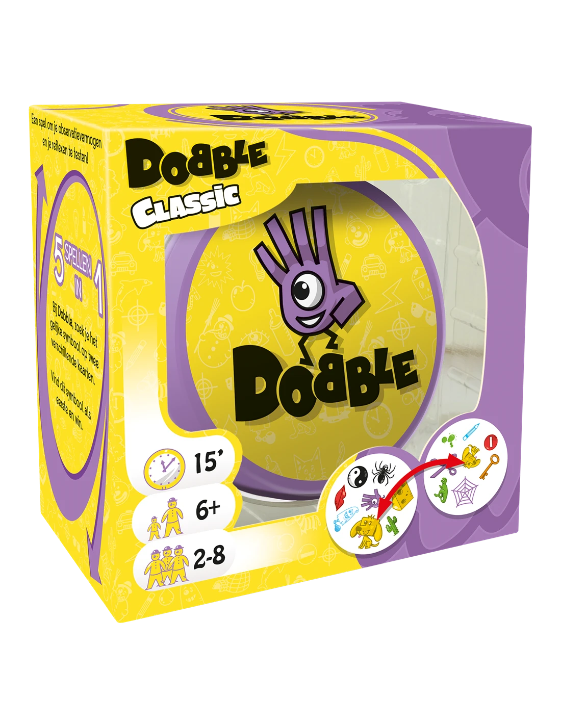 Each card in original Spot it! features eight different symbols, with the symbols varying in size from one card to the next. Any two cards have exactly one symbol in common. For the basic Spot it! game, reveal one card, then another. Whoever spots the symbol in common on both cards claims the first card, then another card is revealed for players to search, and so on. Whoever has collected the most cards when the 55-card deck runs out wins!