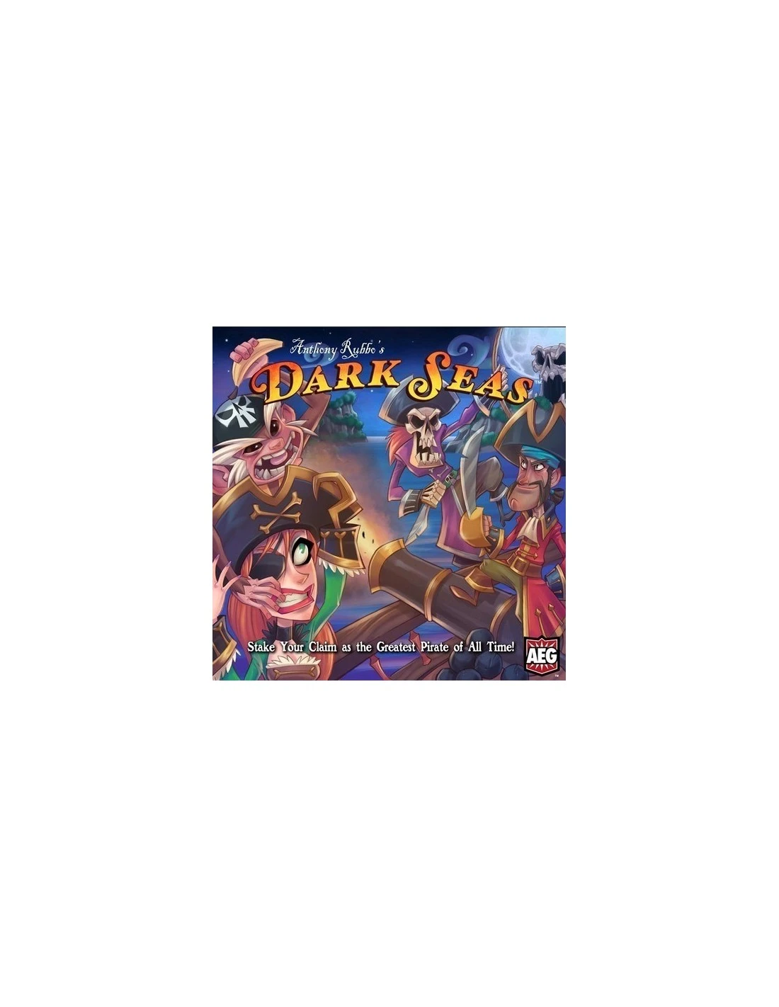 Dark Seas is a dicey island-building game. Each player plots out his own plundering route, filling its ports with docks, hideouts, and shady sea-faring characters. Players sail their ships around their islands, building their reputation by recruiting pirates, gathering doubloons, and acquiring treasure and infamy. Whoever amasses the greatest reputation wins!