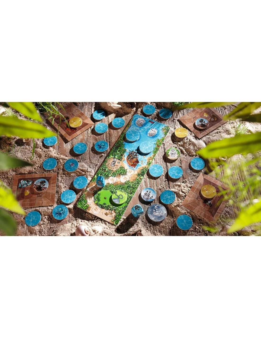 Contents: 1 Pirate Cove game board, 1 ghost of Capt’n Whitebeard figure, 30 ocean tiles, 1 fortune coin, 4 treasure chest layouts, 1 die.
