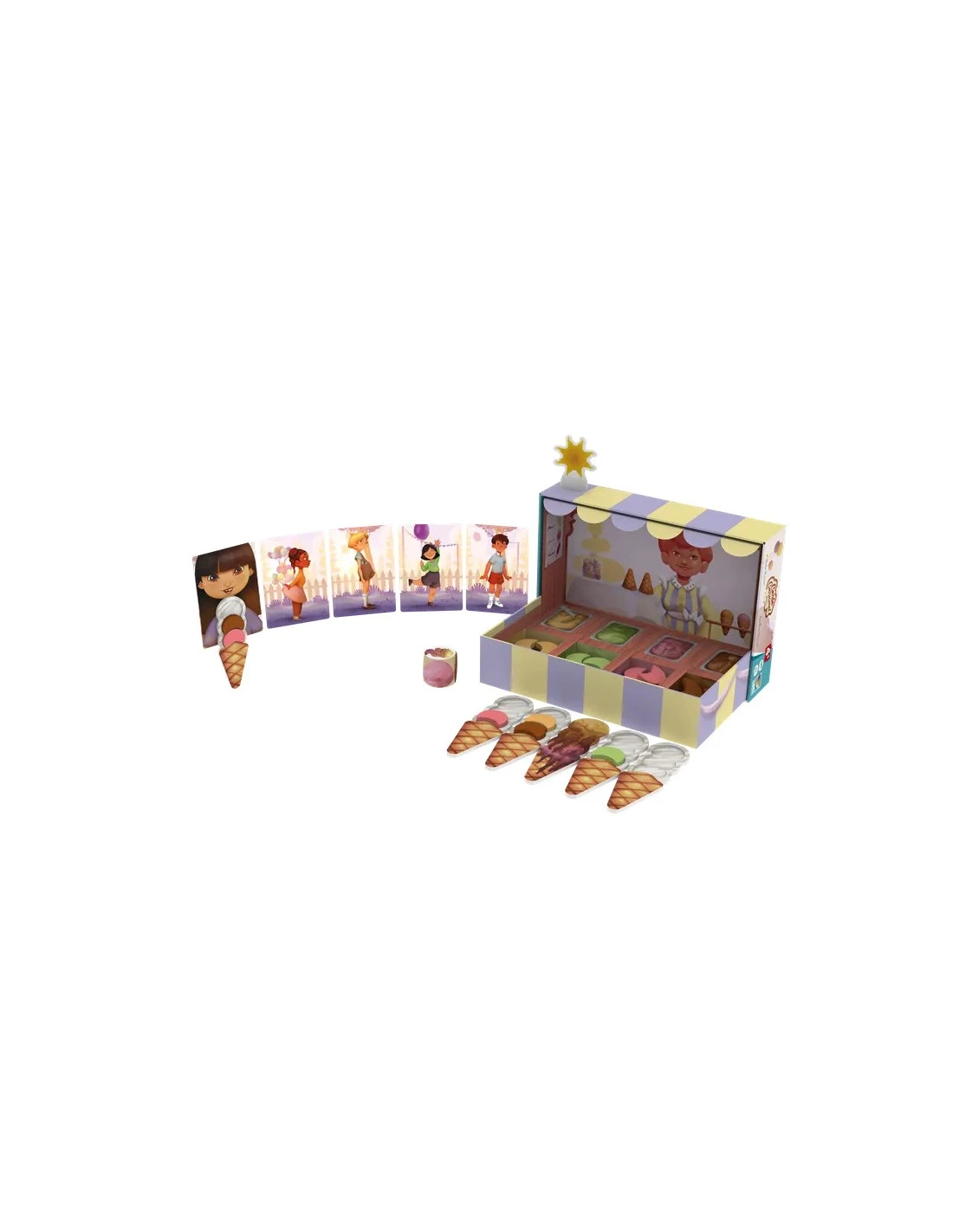 By taking turns, each players will help the ice cream vendor satisfy the kids lining up in front of her Stand by rolling a die, which will either let you add a flavor to an ice cream or move the sun one space, or roll a kid, and give an ice cream to one of the children. Once everyone gets an ice cream, you win! But be careful to the sun, which can melt the ice creams.