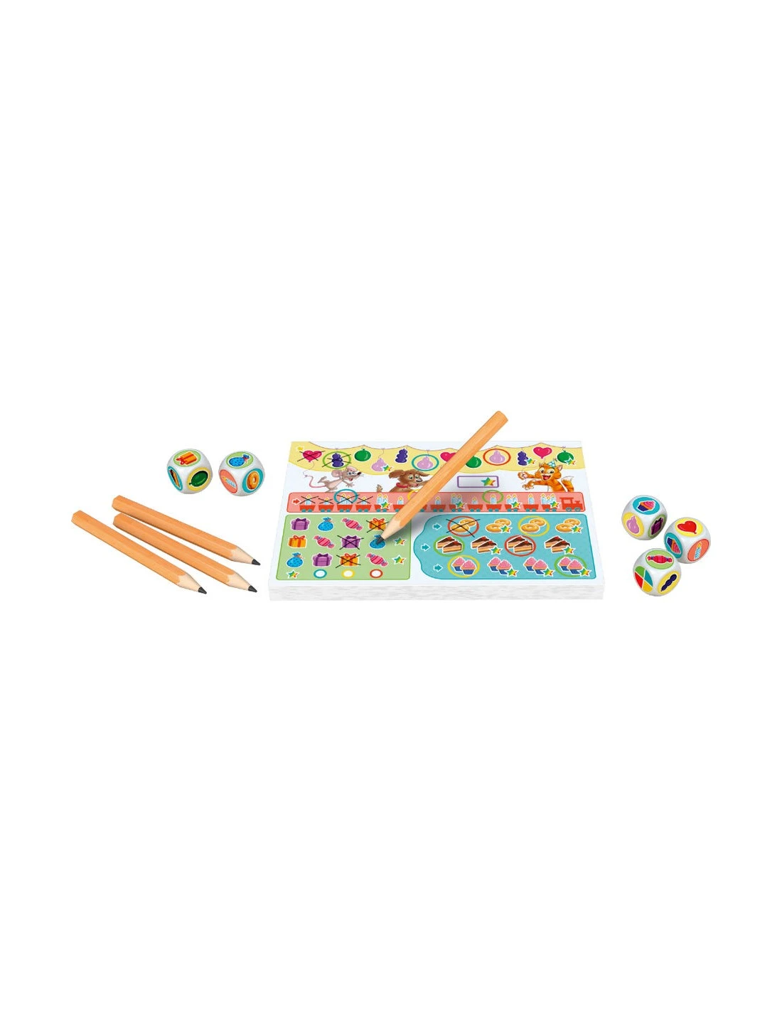 Sweets in the blue area are depicted in pairs in rows β doughnuts, cake, cupcakes β and you mark spaces in a row left to right as long as you have a pair of matching sweets on the dice.