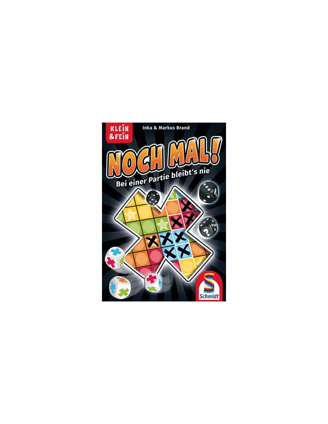 In Encore!, first published as Noch mal!, the dice determine which color and how many spaces you can mark off on your playing sheet — but the starting player may first evaluate what everyone’s doing, then remove two dice, leaving everyone else to make their choices with the dice that remain…