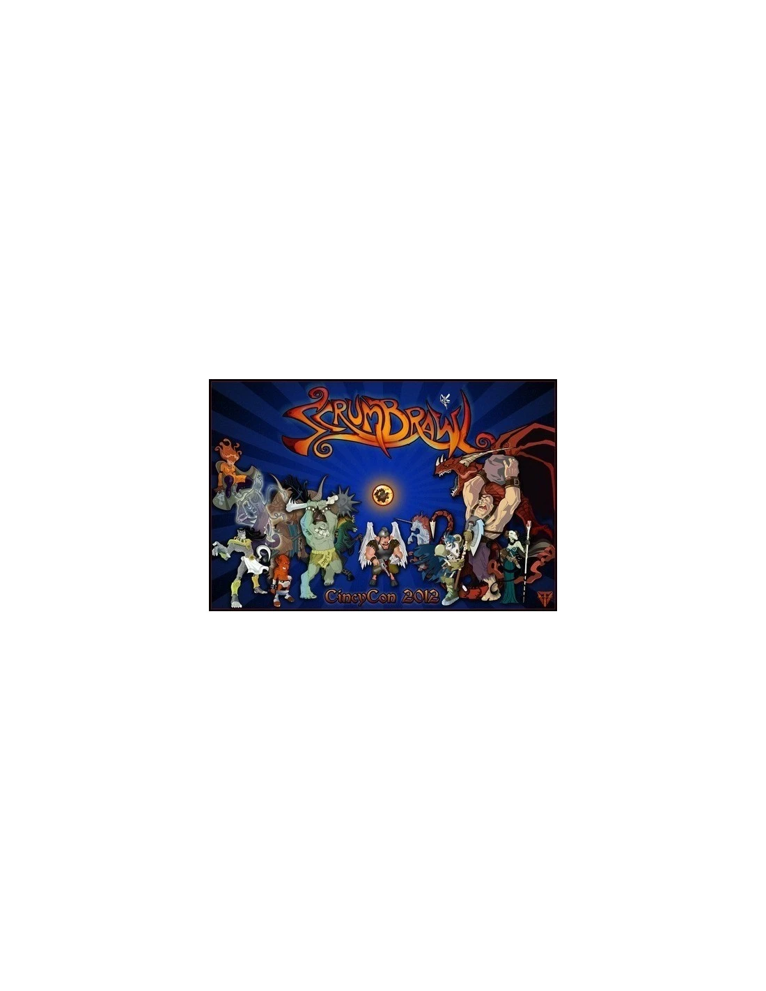 ScrumBrawl is a board game where players control fantastic creatures vying for supremacy within the Arena, scoring goals by maneuvering various types of enchanted orbs into portals set within the Arena or fighting other creatures to the death to prevent them from reaching the portals. The 100-card deck contains fifty creatures with different characteristics that determine how the creature interacts with the orbs (throw accuracy, catching ability, and throwing range), how fast a creature can move, and how effective it is in battle. Many creatures also have unique magic abilities that can be used to manipulate gameplay.