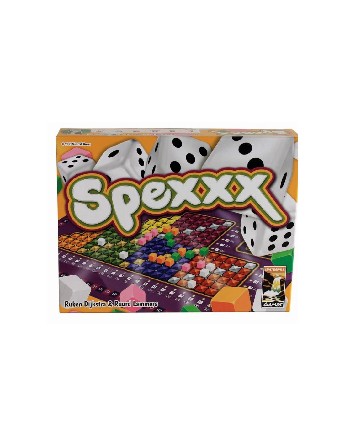 Spexxx could be described as a combination of Yahtzee and Connect Four, but it’s more than that. After a player rolls the 5 dice, (s)he places a cube on the board in the square that represents the rolled dice combination. The objective is to score the most points by placing cubes in squares. When players place three or more of their own cubes in a row, they score points. They can take a risk by aiming for difficult combinations and score more points accordingly. The game ends when all players’ last cubes are placed on the board.