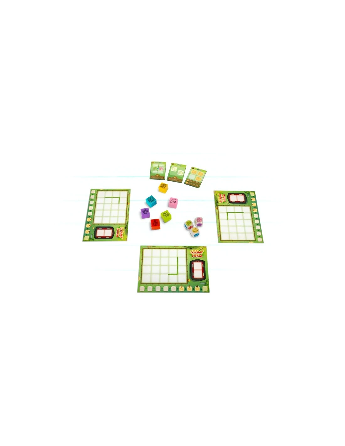 On your turn, roll all three dice in the center of the table, then choose one die and take it. Take the corresponding animal stamp and use it to stamp an empty square of your choice on your farm sheet. Now the next player going clockwise chooses one of the two dice left in the center of the table, without taking it, then uses the corresponding stamp, and so on, until everyone has stamped an animal onto their farm. The face of the dice showing the hay bale is a wild card; if you choose a die showing the hay bale, you can use any stamp.