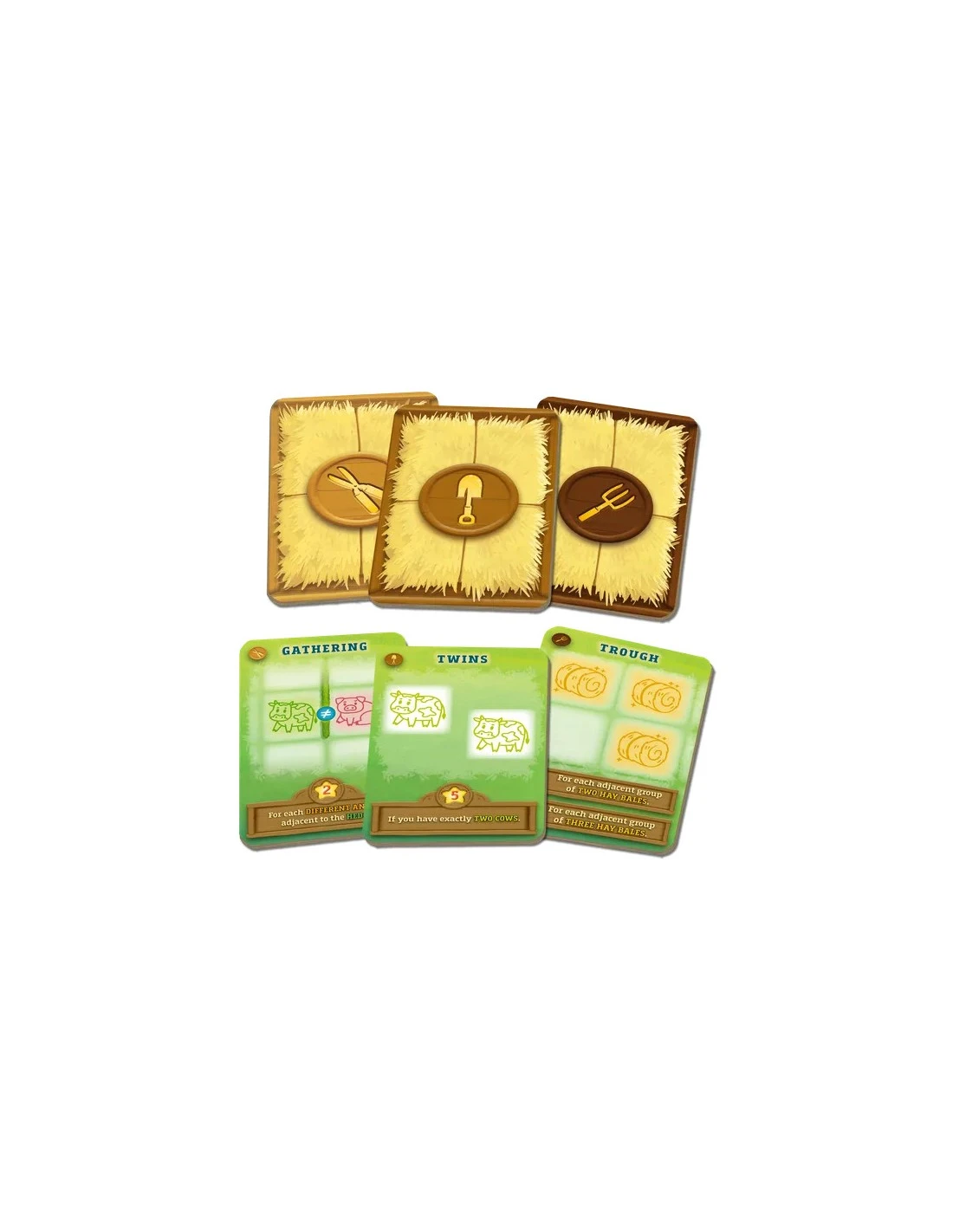 The advanced mode adds the hay bale stamp, hedges on the board, and three random request cards with new ways to score points.