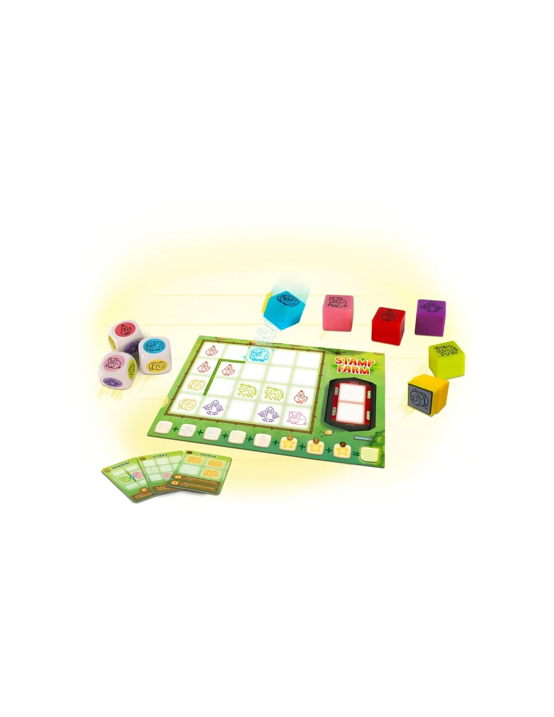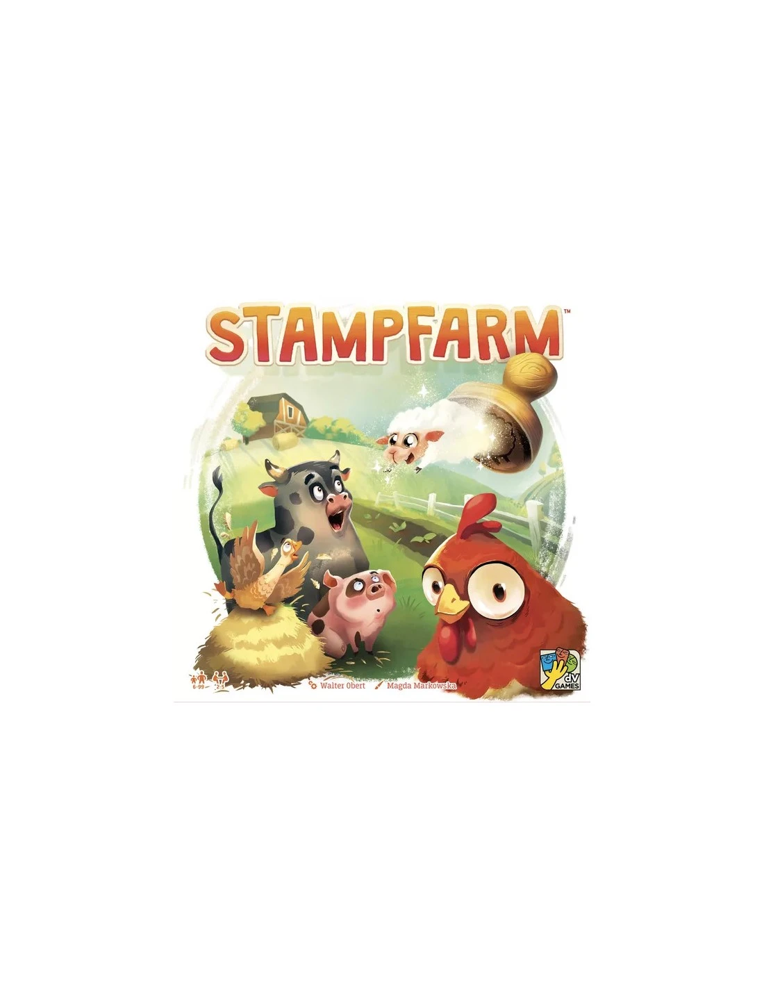 Stampfarm is a roll-and-stamp game that includes six colored stamps showing cow, goose, hen, pig, sheep and hay bale.