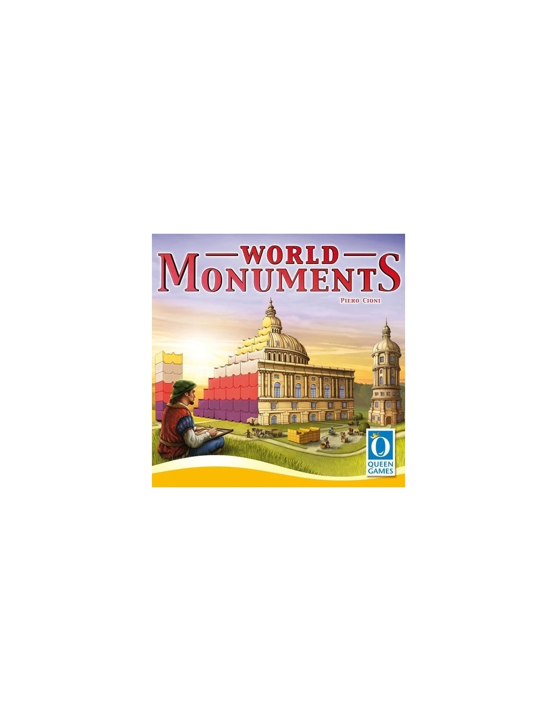 In each game of World Monuments, you and your fellow players choose one of four buildings and start constructing it from the ground up: The Capitol in Washington, the Notre Dame cathedral in Paris, the basilica San Pietro in Rome, or the Taj Mahal mausoleum in Agra. Only the most talented master builder among the players gains many points and has a chance of winning the game, after the building is completed.